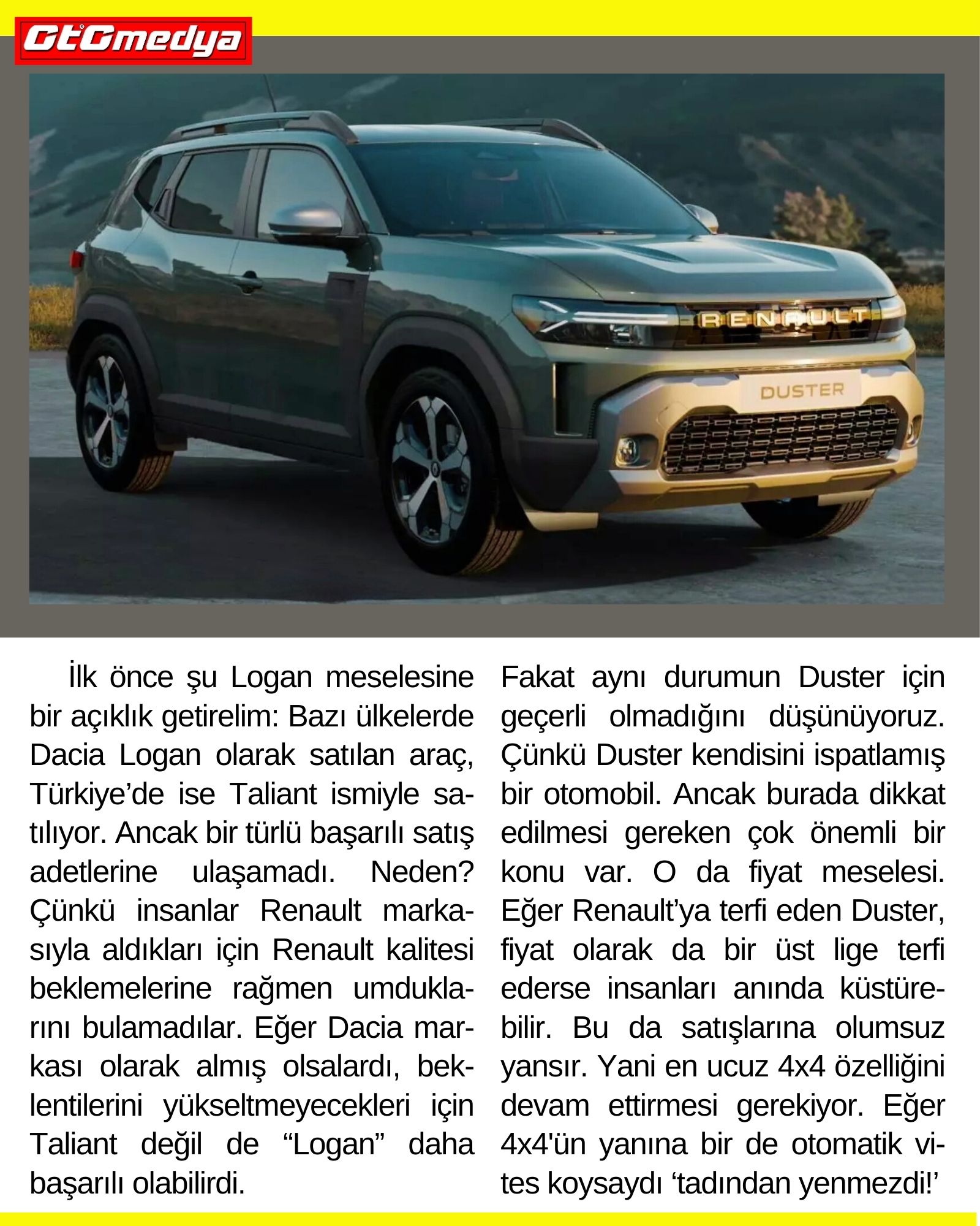 Fakat aynı durumun Duster için geçerli olmadığını düşünüyoruz. Çünkü Duster kendisini ispatlamış bir otomobil. Ancak burada dikkat edilmesi gereken çok önemli bir konu var. O da fiyat meselesi. Eğer Renault’ya terfi eden Duster, fiyat olarak da bir üst lige terfi ederse insanları anında küstürebilir. Bu da satışlarına olumsuz yansır. Yani en ucuz 4x4 özelliğini devam ettirmesi gerekiyor. Eğer 4x4'ün yanına bir de otomatik vites koysaydı ‘tadından yenmezdi!’