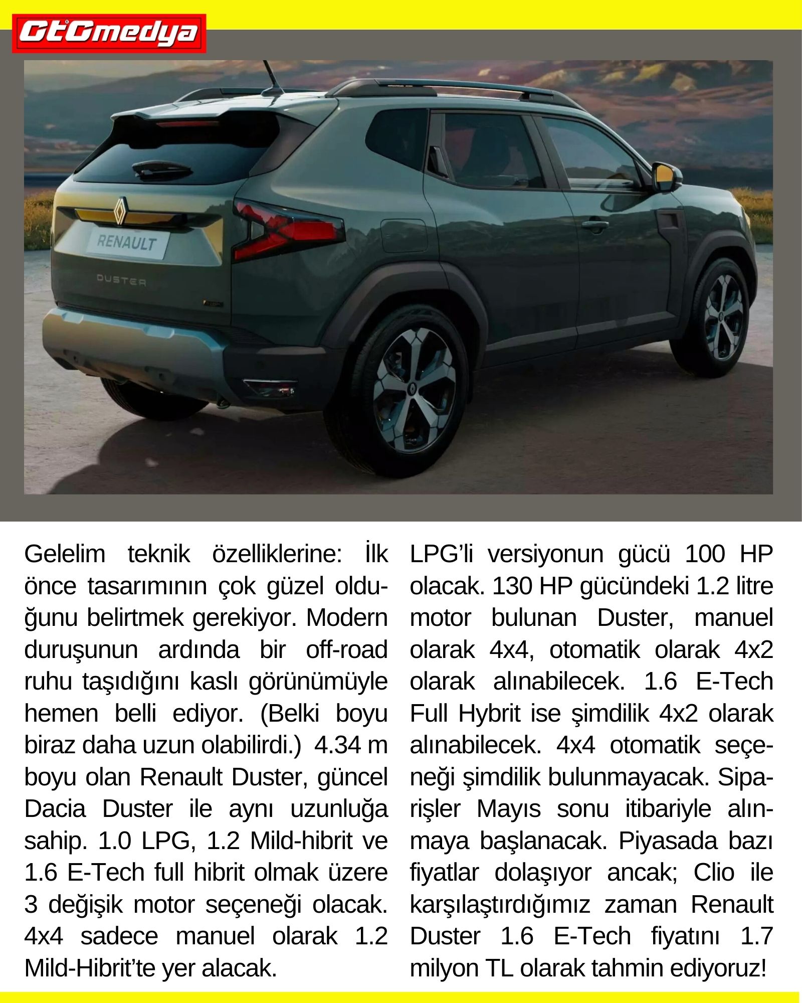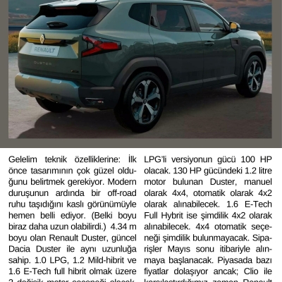 LPG’li versiyonun gücü 100 HP olacak. 130 HP gücündeki 1.2 litre motor bulunan Duster, manuel olarak 4x4, otomatik olarak 4x2 olarak alınabilecek. 1.6 E-Tech Full Hybrit ise şimdilik 4x2 olarak alınabilecek. 4x4 otomatik seçeneği şimdilik bulunmayacak. Siparişler Mayıs sonu itibariyle alınmaya başlanacak. Piyasada bazı fiyatlar dolaşıyor ancak; Clio ile karşılaştırdığımız zaman Renault Duster 1.6 E-Tech fiyatını 1.7 milyon TL olarak tahmin ediyoruz!