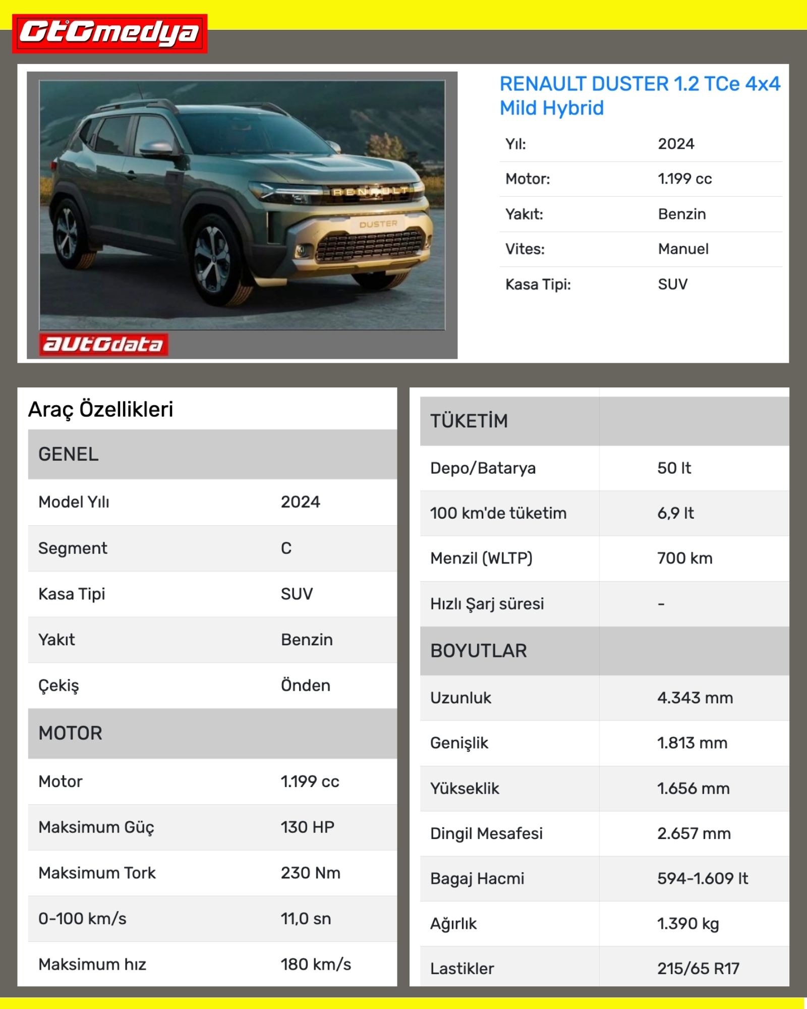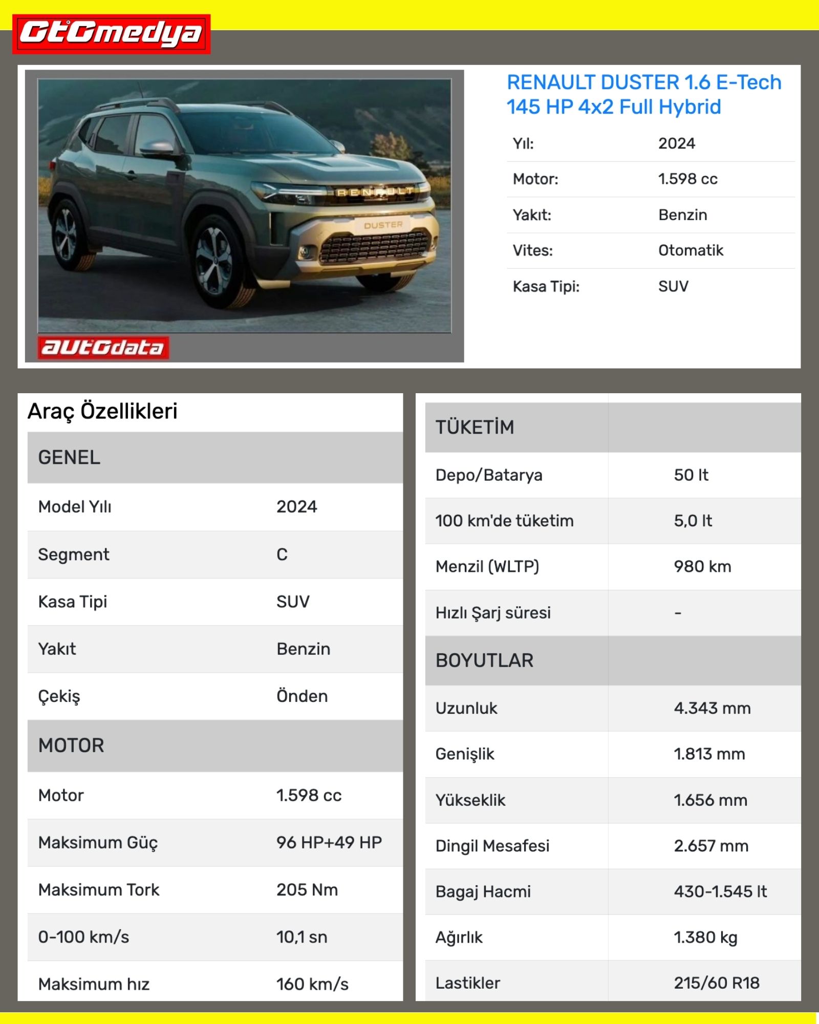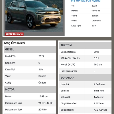 Gelelim teknik özelliklerine: İlk önce tasarımının çok güzel olduğunu belirtmek gerekiyor. Modern duruşunun ardında bir off-road ruhu taşıdığını kaslı görünümüyle hemen belli ediyor. (Belki boyu biraz daha uzun olabilirdi.) 4.34 m boyu olan Renault Duster, güncel Dacia Duster ile aynı uzunluğa sahip. 1.0 LPG, 1.2 Mild-hibrit ve 1.6 E-Tech full hibrit olmak üzere 3 değişik motor seçeneği olacak. 4x4 sadece manuel olarak 1.2 Mild-Hibrit’te yer alacak. Yeni Duster'da artık dizel motor yer almayacak.