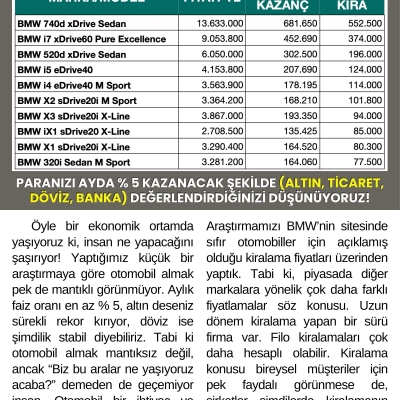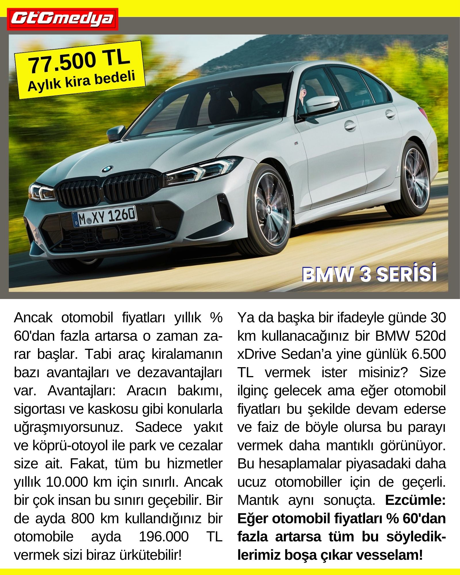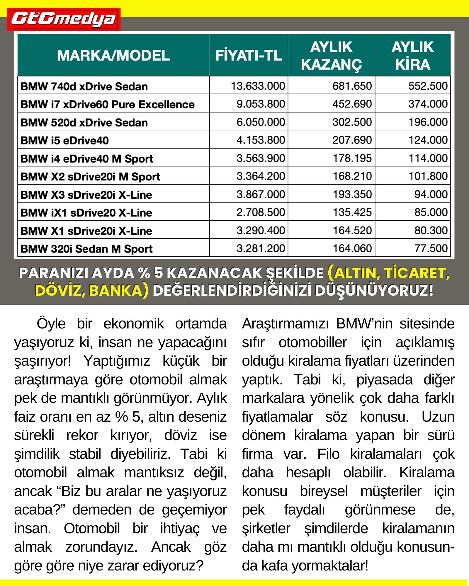 Araştırmamızı BMW’nin sitesinde sıfır otomobiller için açıklamış olduğu kiralama fiyatları üzerinden yaptık. Tabi ki, piyasada diğer markalara yönelik çok daha farklı fiyatlamalar söz konusu. Uzun dönem kiralama yapan bir sürü firma var. Filo kiralamaları çok daha hesaplı olabilir. Kiralama konusu bireysel müşteriler için pek faydalı görünmese de, şirketler şimdilerde kiralamanın daha mı mantıklı olduğu konusun-da kafa yormaktalar!
