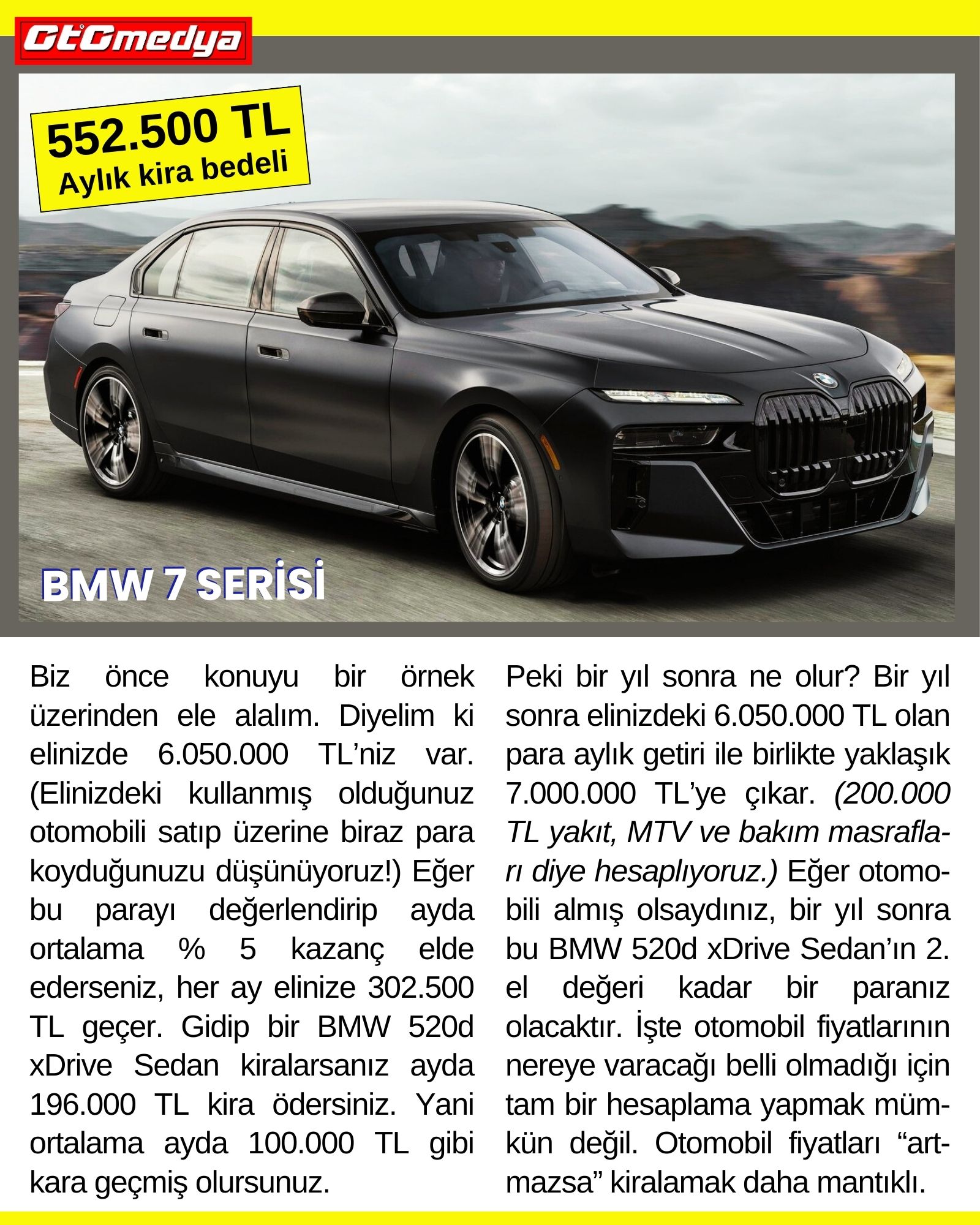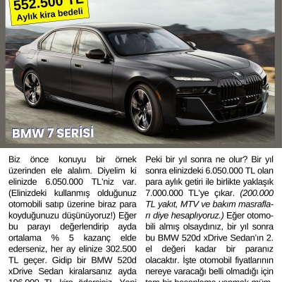 Biz önce konuyu bir örnek üzerinden ele alalım. Diyelim ki elinizde 6.050.000 TL’niz var. (Elinizdeki kullanmış olduğunuz otomobili satıp üzerine biraz para koyduğunuzu düşünüyoruz!) Eğer bu parayı değerlendirip ayda ortalama % 5 kazanç elde ederseniz, her ay elinize 302.500 TL geçer. Gidip bir BMW 520d xDrive Sedan kiralarsanız ayda 196.000 TL kira ödersiniz. Yani ortalama ayda 100.000 TL gibi kara geçmiş olursunuz.