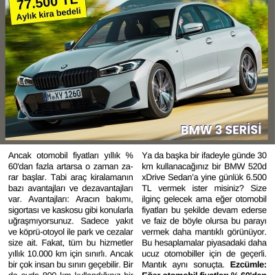 Ya da başka bir ifadeyle günde 30 km kullanacağınız bir BMW 520d xDrive Sedan’a yine günlük 6.500 TL vermek ister misiniz? Size ilginç gelecek ama eğer otomobil fiyatları bu şekilde devam ederse ve faiz de böyle olursa bu parayı vermek daha mantıklı görünüyor. Bu hesaplamalar piyasadaki daha ucuz otomobiller için de geçerli. Mantık aynı sonuçta. Ezcümle: Eğer otomobil fiyatları % 60'dan fazla artarsa tüm bu söyledik-lerimiz boşa çıkar vesselam!