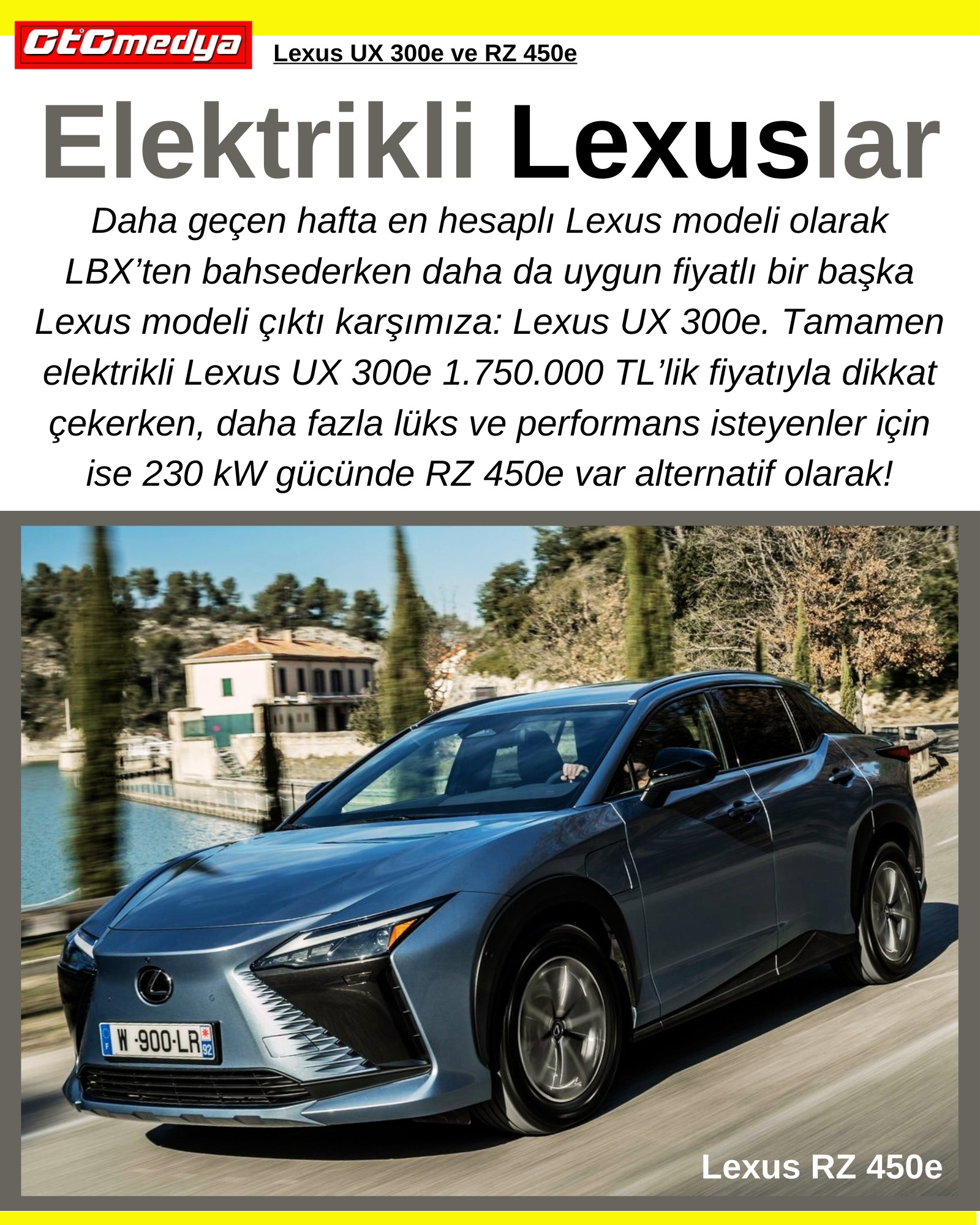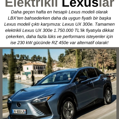 Daha geçen hafta en hesaplı Lexus modeli olarak LBX’ten bahsederken daha da uygun fiyatlı bir başka Lexus modeli çıktı karşımıza: Lexus UX 300e. Tamamen elektrikli Lexus UX 300e 1.750.000 TL’lik fiyatıyla dikkat çekerken, daha fazla lüks ve performans isteyenler için ise 230 kW gücünde RZ 450e var alternatif olarak!