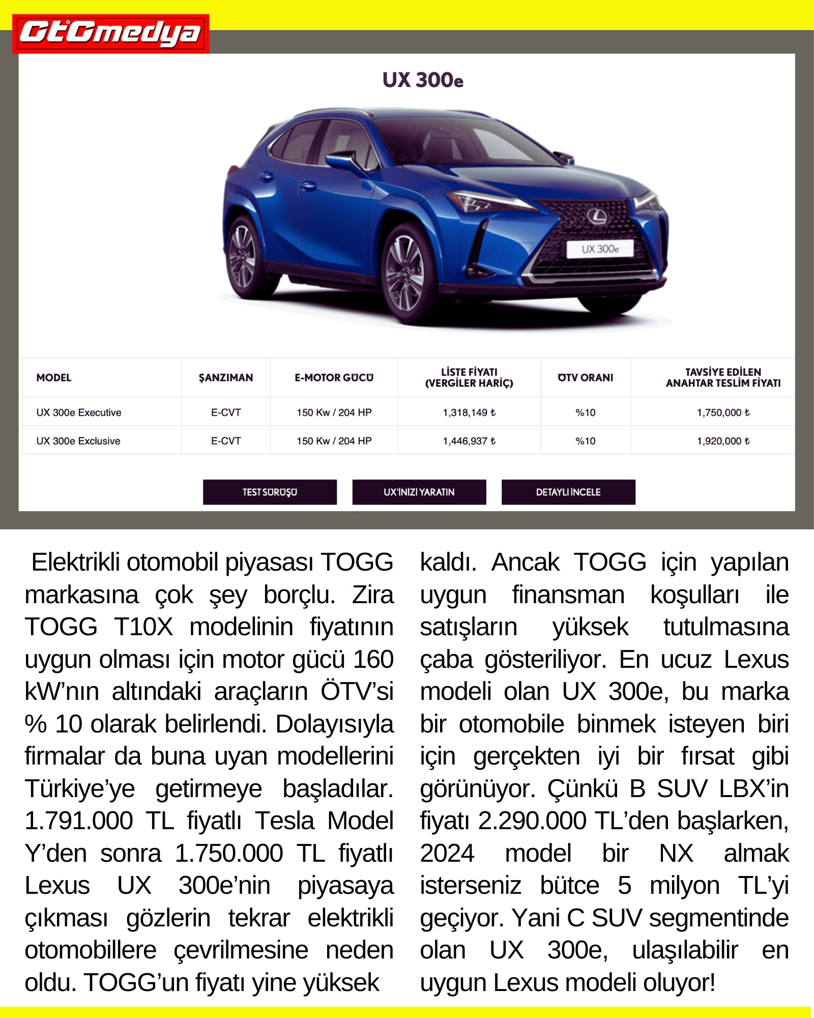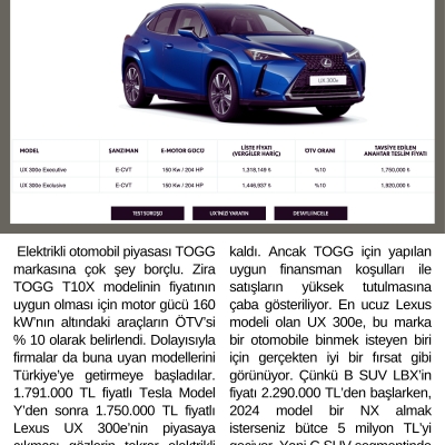 Elektrikli otomobil piyasası TOGG markasına çok şey borçlu. Zira TOGG T10X modelinin fiyatının uygun olması için motor gücü 160 kW’nın altındaki araçların ÖTV’si % 10 olarak belirlendi. Dolayısıyla firmalar da buna uyan modellerini Türkiye’ye getirmeye başladılar. 1.791.000 TL fiyatlı Tesla Model Y’den sonra 1.750.000 TL fiyatlı Lexus UX 300e’nin piyasaya çıkması gözlerin tekrar elektrikli otomobillere çevrilmesine neden oldu. TOGG’un fiyatı yine yüksek kaldı. Ancak TOGG için yapılan uygun finansman koşulları ile satışların yüksek tutulmasına çaba gösteriliyor.