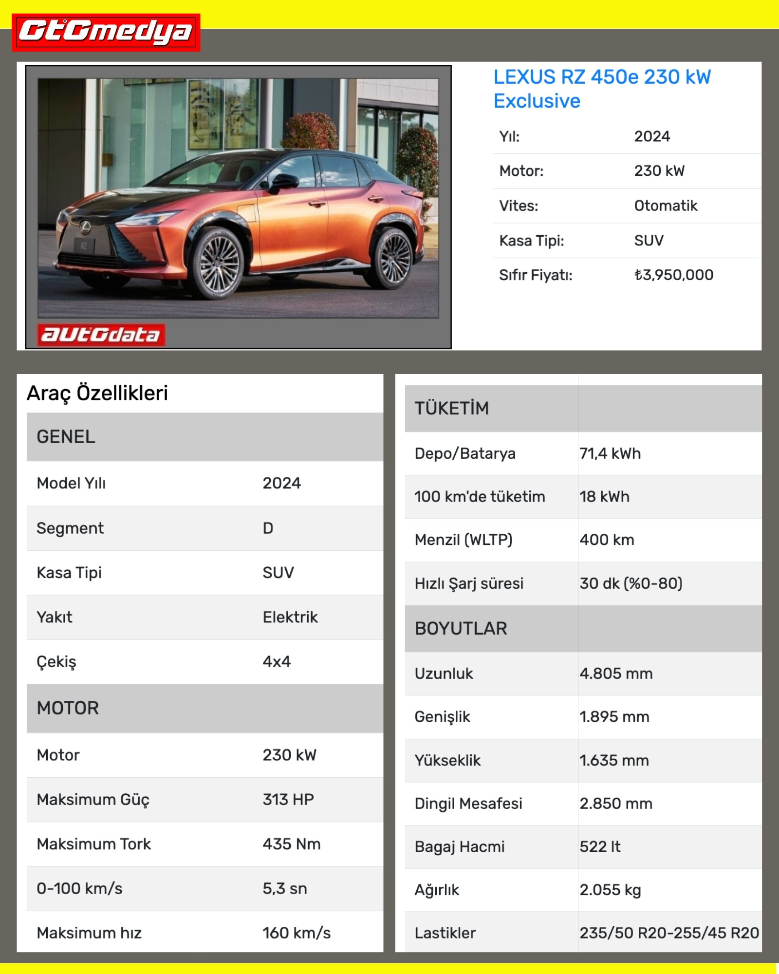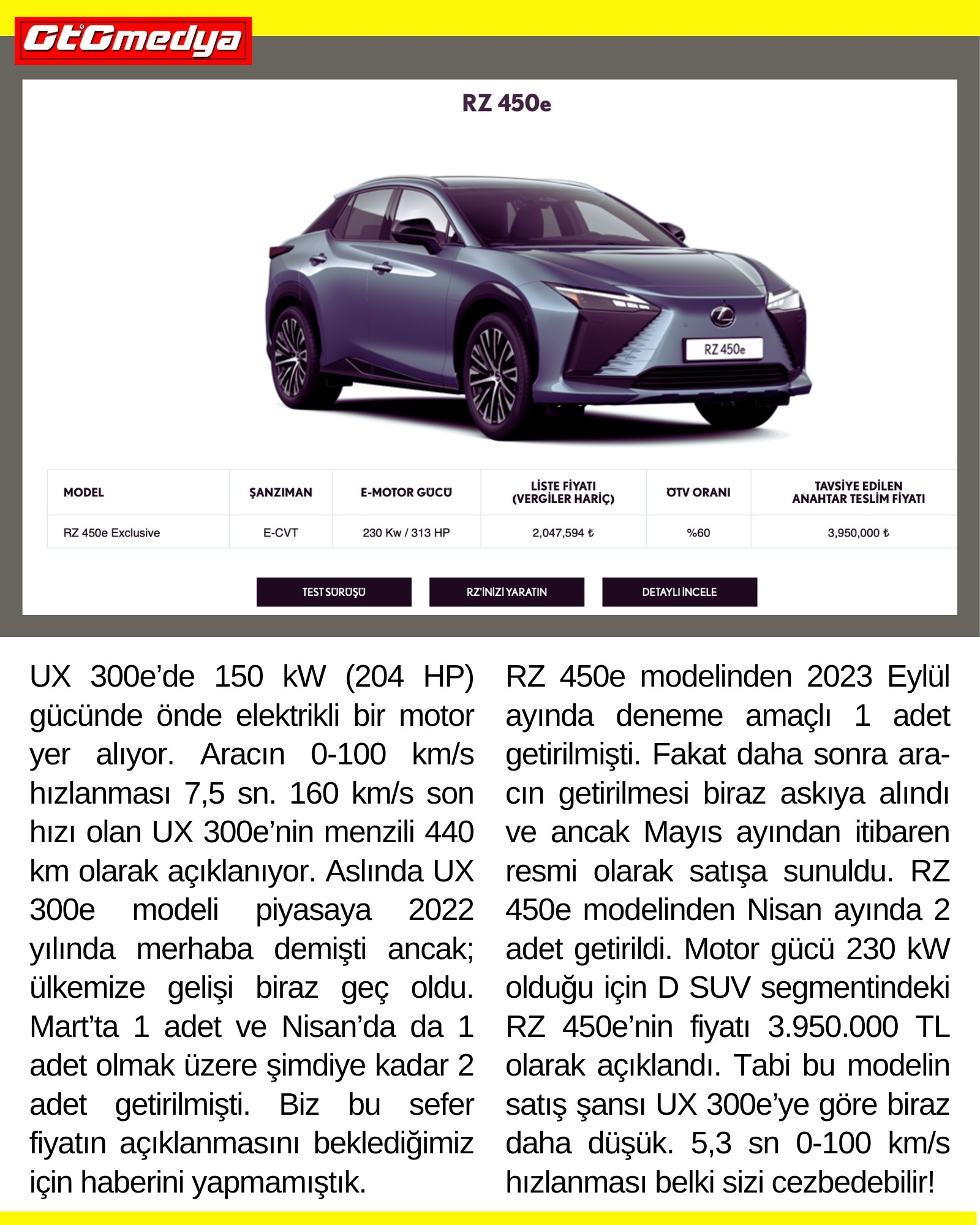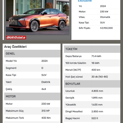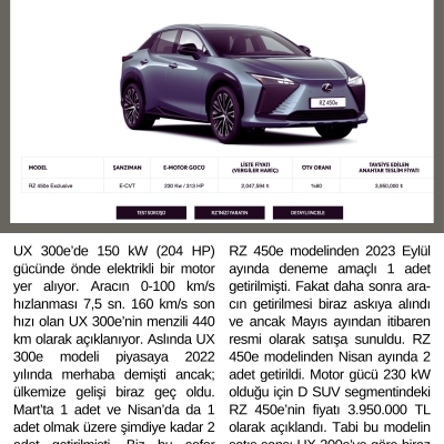 RZ 450e modelinden 2023 Eylül ayında deneme amaçlı 1 adet getirilmişti. Fakat daha sonra ara-cın getirilmesi biraz askıya alındı ve ancak Mayıs ayından itibaren resmi olarak satışa sunuldu. RZ 450e modelinden Nisan ayında 2 adet getirildi. Motor gücü 230 kW olduğu için D SUV segmentindeki RZ 450e’nin fiyatı 3.950.000 TL olarak açıklandı. Tabi bu modelin satış şansı UX 300e’ye göre biraz daha düşük. 5,3 sn 0-100 km/s hızlanması belki sizi cezbedebilir!