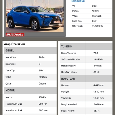UX 300e’de 150 kW (204 HP) gücünde önde elektrikli bir motor yer alıyor. Aracın 0-100 km/s hızlanması 7,5 sn. 160 km/s son hızı olan UX 300e’nin menzili 440 km olarak açıklanıyor. Aslında UX 300e modeli piyasaya 2022 yılında merhaba demişti ancak; ülkemize gelişi biraz geç oldu. Mart’ta 1 adet ve Nisan’da da 1 adet olmak üzere şimdiye kadar 2 adet getirilmişti. Biz bu sefer fiyatın açıklanmasını beklediğimiz için haberini yapmamıştık.
