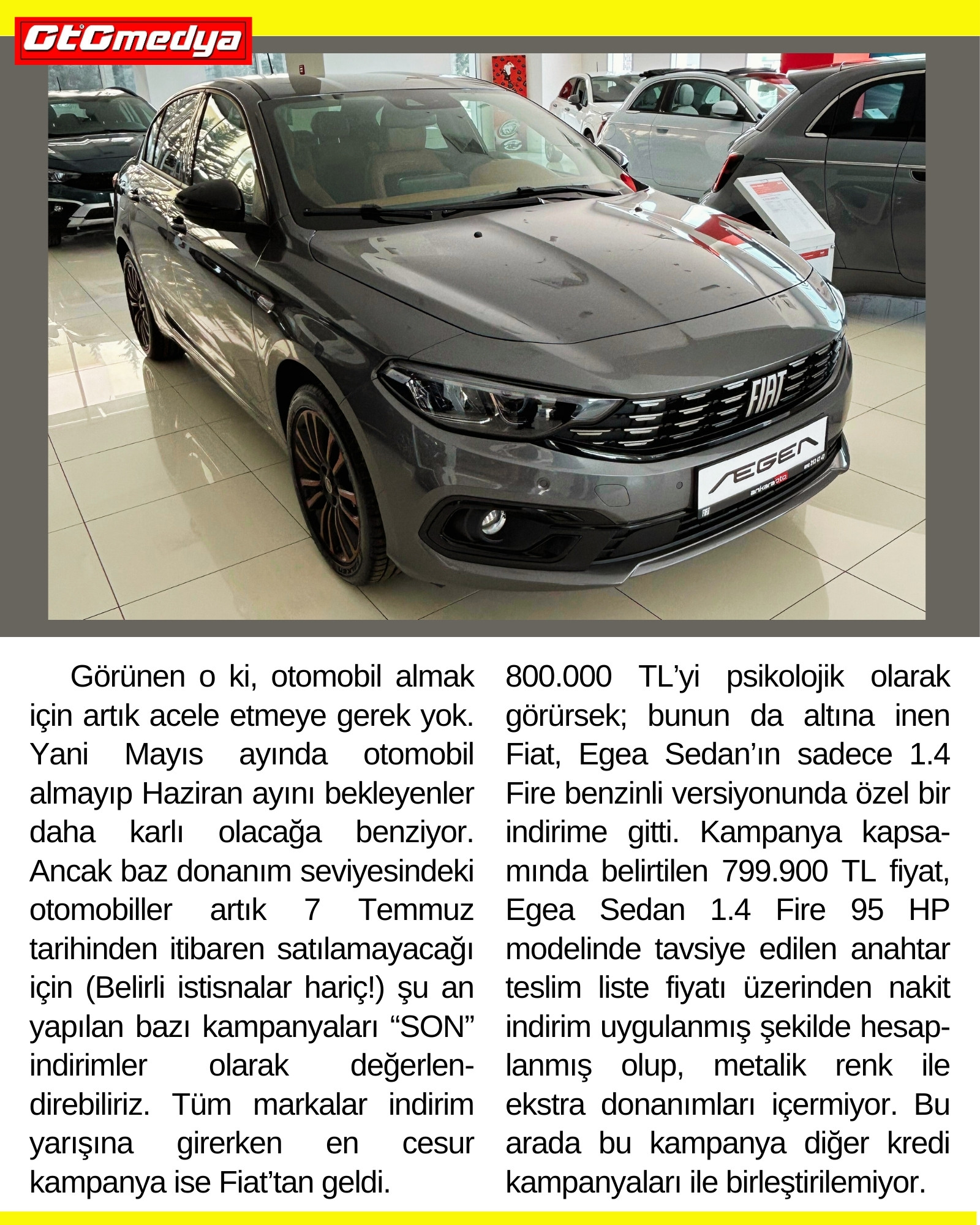 Görünen o ki, otomobil almak için artık acele etmeye gerek yok. Yani Mayıs ayında otomobil almayıp Haziran ayını bekleyenler daha karlı olacağa benziyor. Ancak baz donanım seviyesindeki otomobiller artık 7 Temmuz tarihinden itibaren satılamayacağı için (Belirli istisnalar hariç!) şu an yapılan bazı kampanyaları “SON” indirimler olarak değerlen-direbiliriz. Tüm markalar indirim yarışına girerken en cesur kampanya ise Fiat’tan geldi.