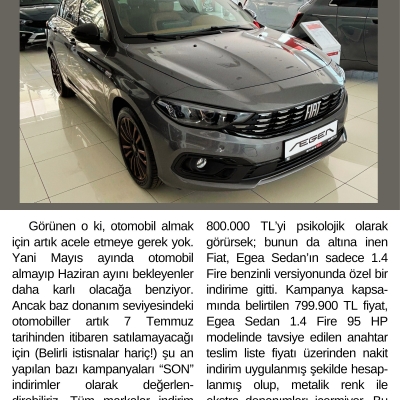 800.000 TL’yi psikolojik olarak görürsek; bunun da altına inen Fiat, Egea Sedan’ın sadece 1.4 Fire benzinli versiyonunda özel bir indirime gitti. Kampanya kapsa-mında belirtilen 799.900 TL fiyat, Egea Sedan 1.4 Fire 95 HP modelinde tavsiye edilen anahtar teslim liste fiyatı üzerinden nakit indirim uygulanmış şekilde hesap-lanmış olup, metalik renk ile ekstra donanımları içermiyor. Bu arada bu kampanya diğer kredi kampanyaları ile birleştirilemiyor.