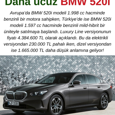 Avrupa’da BMW 520i modeli 1.998 cc hacminde benzinli bir motora sahipken, Türkiye’de ise BMW 520i modeli 1.597 cc hacminde benzinli mild-hibrit bir üniteyle satılmaya başlandı. Luxury Line versiyonunun fiyatı 4.384.600 TL olarak açıklandı. Bu da elektrikli versiyondan 230.000 TL pahalı iken, dizel versiyondan ise 1.665.000 TL daha düşük anlamına geliyor!