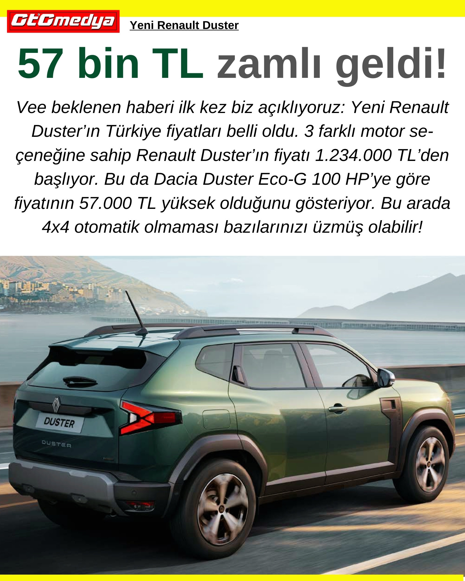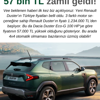Vee beklenen haberi ilk kez biz açıklıyoruz: Yeni Renault Duster’ın Türkiye fiyatları belli oldu. 3 farklı motor seçeneğine sahip Renault Duster’ın fiyatı 1.234.000 TL’den başlıyor. Bu da Dacia Duster Eco-G 100 HP’ye göre fiyatının 57.000 TL yüksek olduğunu gösteriyor. Bu arada 4x4 otomatik olmaması bazılarınızı üzmüş olabilir!