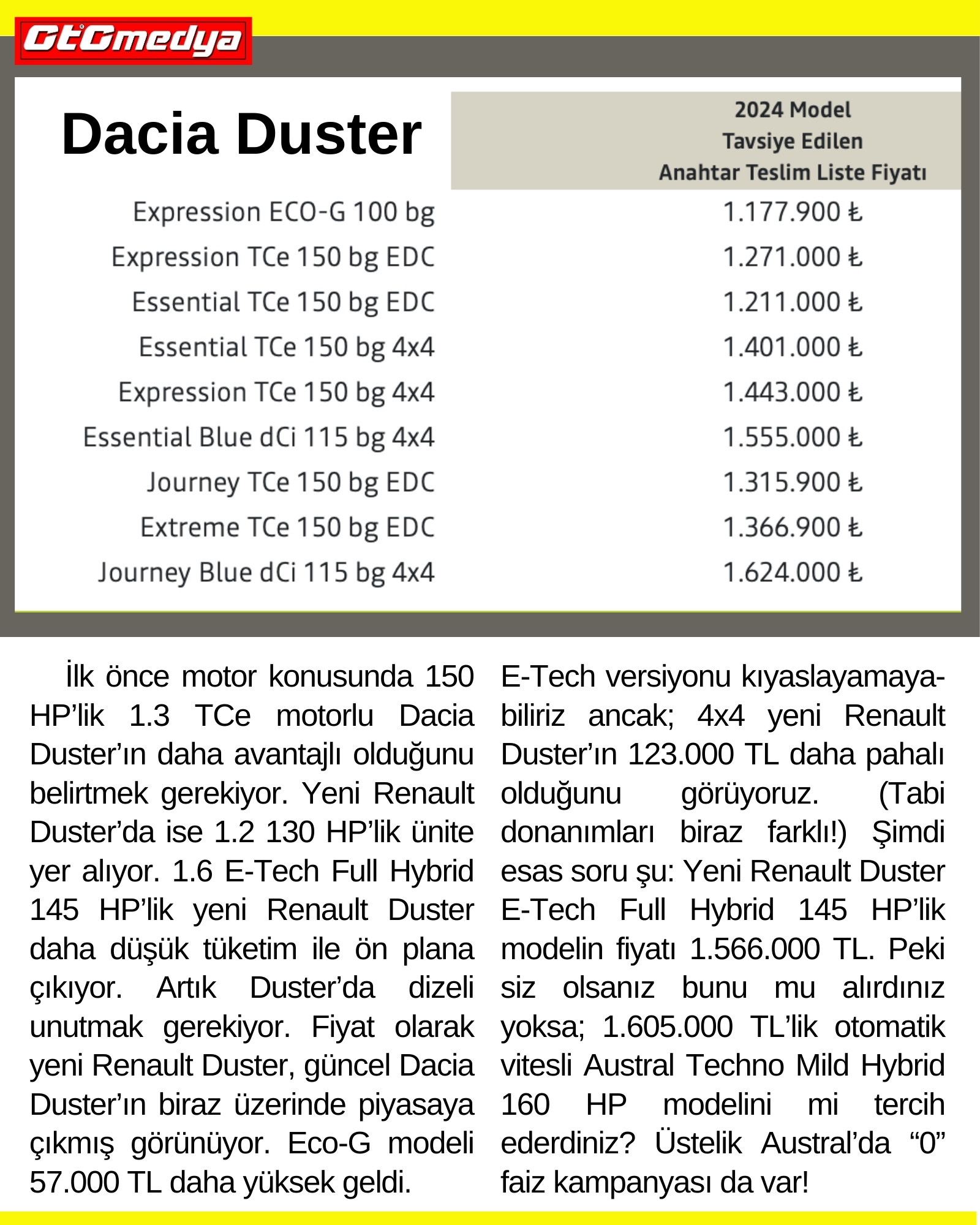 E-Tech versiyonu kıyaslayamaya-biliriz ancak; 4x4 yeni Renault Duster’ın 123.000 TL daha pahalı olduğunu görüyoruz. (Tabi donanımları biraz farklı!) Şimdi esas soru şu: Yeni Renault Duster E-Tech Full Hybrid 145 HP’lik modelin fiyatı 1.566.000 TL. Peki siz olsanız bunu mu alırdınız yoksa; 1.605.000 TL’lik otomatik vitesli Austral Techno Mild Hybrid 160 HP modelini mi tercih ederdiniz? Üstelik Austral’da “0” faiz kampanyası da var!