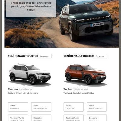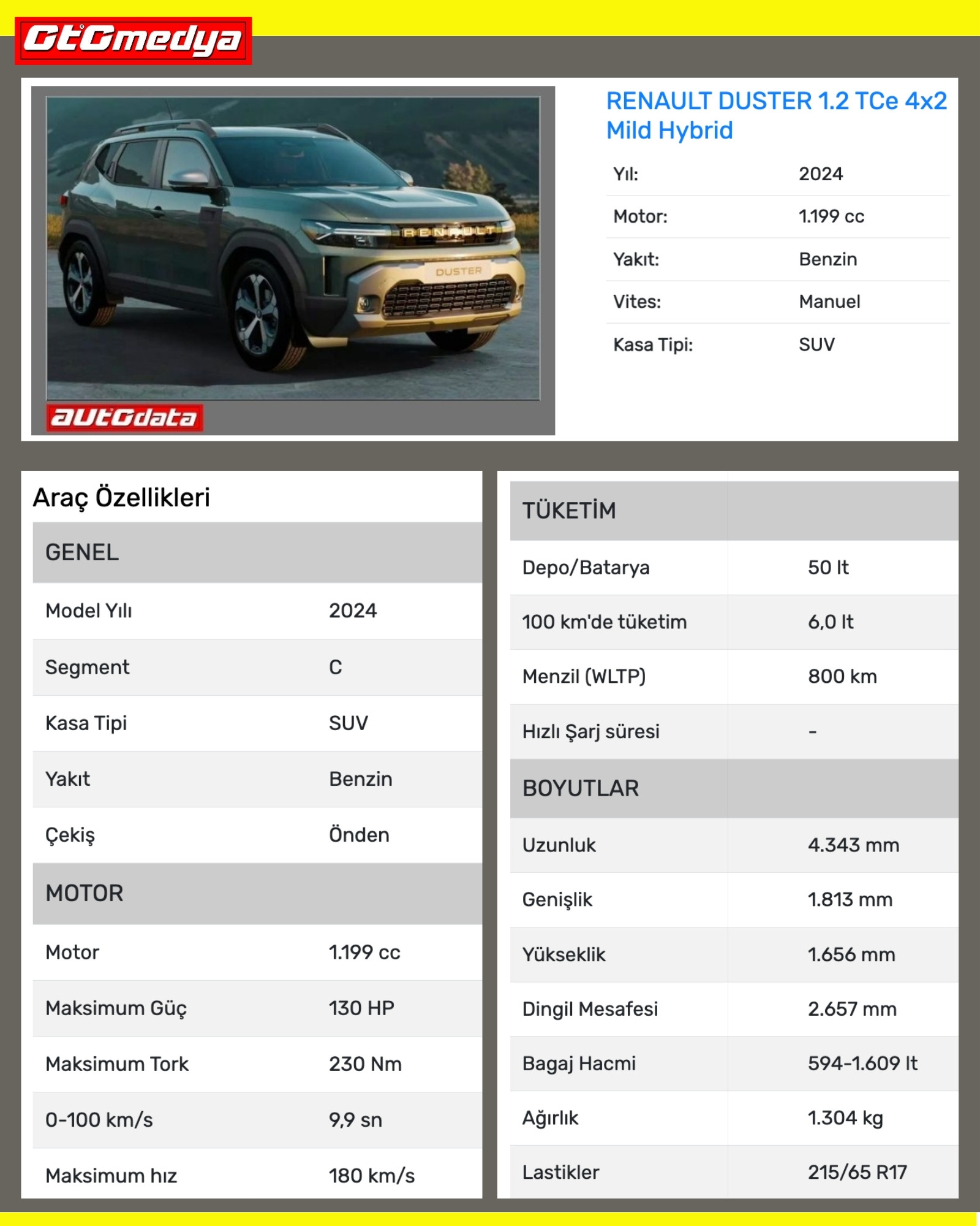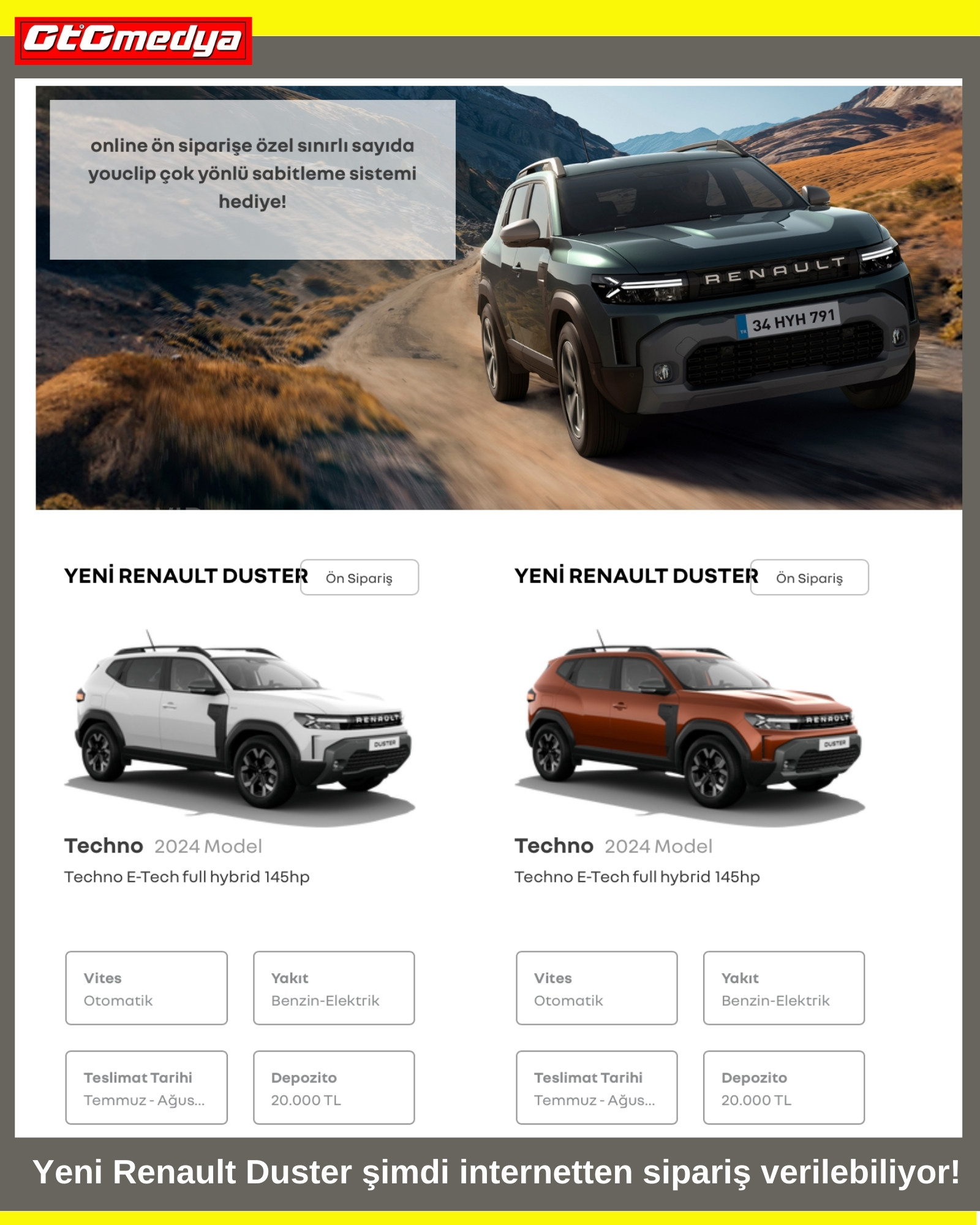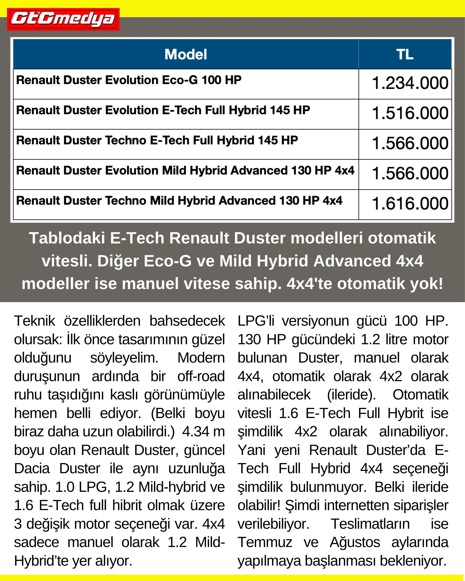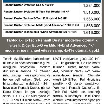 LPG’li versiyonun gücü 100 HP. 130 HP gücündeki 1.2 litre motor bulunan Duster, manuel olarak 4x4, otomatik olarak 4x2 olarak alınabilecek (ileride). Otomatik vitesli 1.6 E-Tech Full Hybrit ise şimdilik 4x2 olarak alınabiliyor. Yani yeni Renault Duster’da E-Tech Full Hybrid 4x4 seçeneği şimdilik bulunmuyor. Belki ileride olabilir! Şimdi internetten siparişler verilebiliyor. Teslimatların ise Temmuz ve Ağustos aylarında yapılmaya başlanması bekleniyor. (Fiyat listesi için fotoğraflara bakınız!)