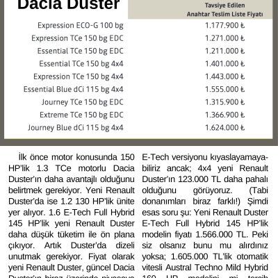 İlk önce motor konusunda 150 HP’lik 1.3 TCe motorlu Dacia Duster’ın daha avantajlı olduğunu belirtmek gerekiyor. Yeni Renault Duster’da ise 1.2 130 HP’lik ünite yer alıyor. 1.6 E-Tech Full Hybrid 145 HP’lik yeni Renault Duster daha düşük tüketim ile ön plana çıkıyor. Artık Duster’da dizeli unutmak gerekiyor. Fiyat olarak yeni Renault Duster, güncel Dacia Duster’ın biraz üzerinde piyasaya çıkmış görünüyor. Eco-G modeli 57.000 TL daha yüksek geldi.