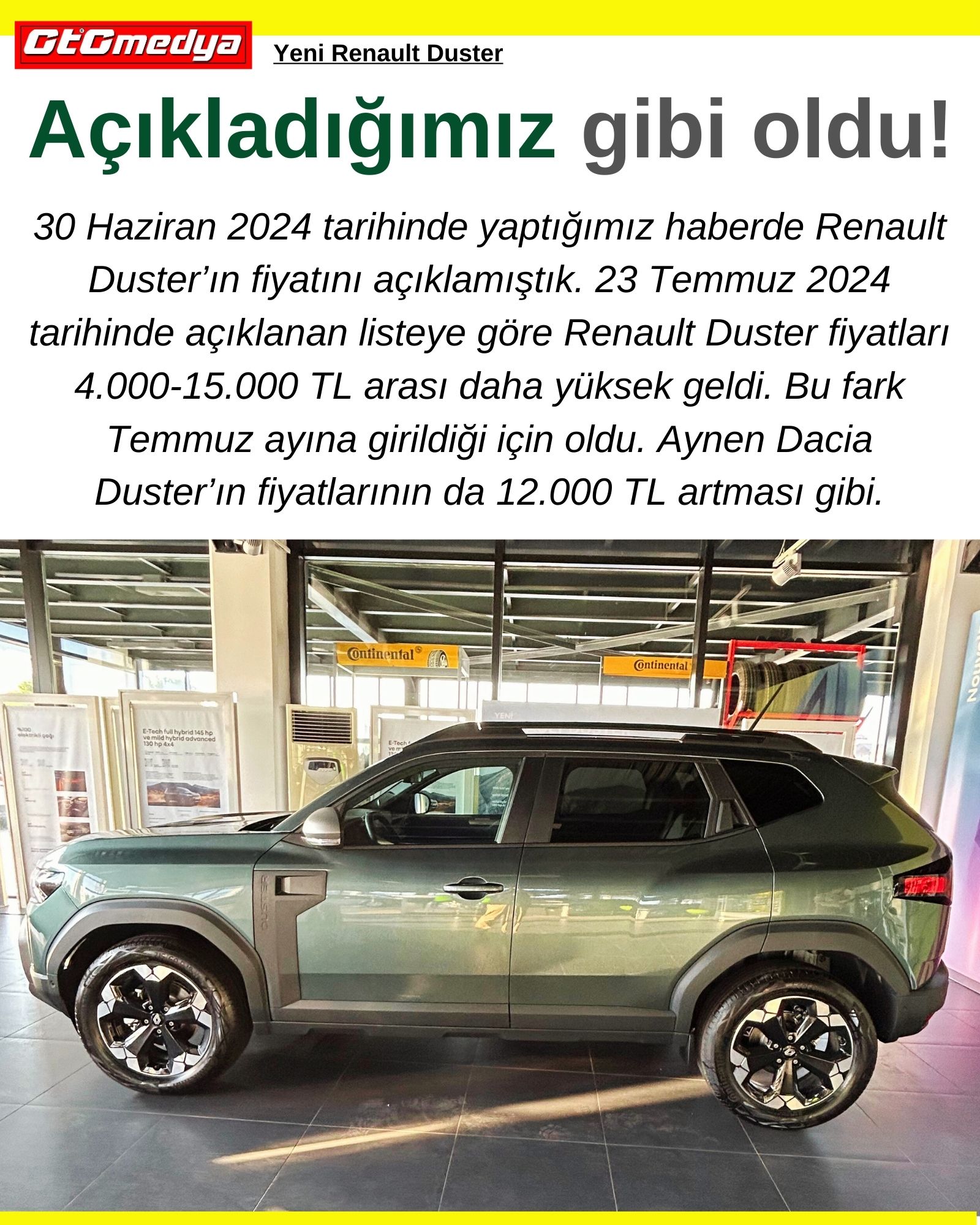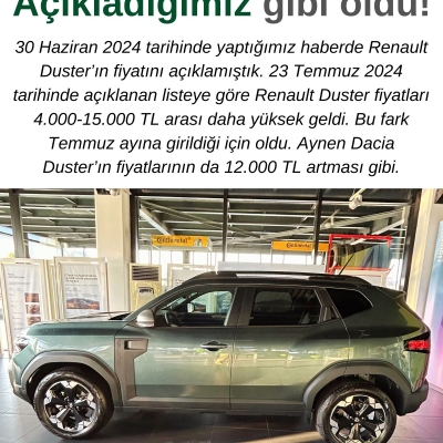 30 Haziran 2024 tarihinde yaptığımız haberde Renault Duster’ın fiyatını açıklamıştık. 23 Temmuz 2024 tarihinde açıklanan listeye göre Renault Duster fiyatları 4.000-15.000 TL arası daha yüksek geldi. Bu fark Temmuz ayına girildiği için oldu. Aynen Dacia Duster’ın fiyatlarının da 12.000 TL artması gibi.