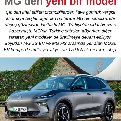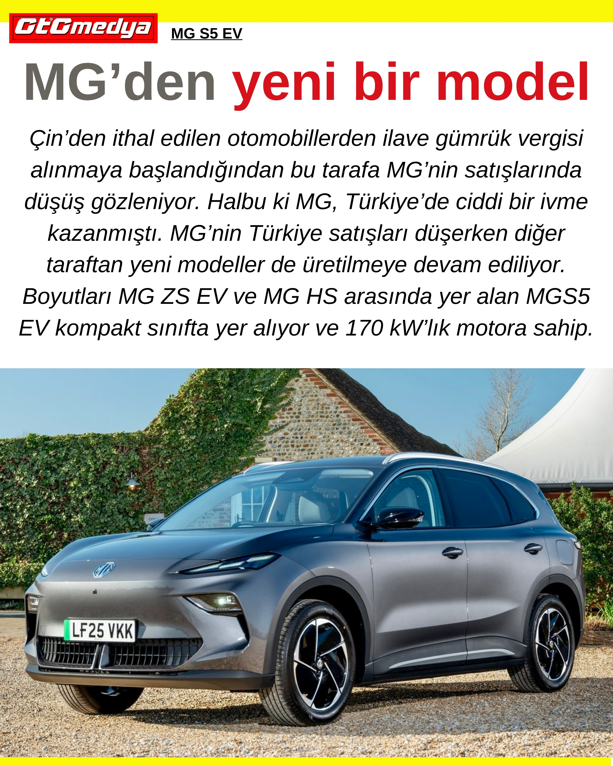 Çin’den ithal edilen otomobillerden ilave gümrük vergisi alınmaya başlandığından bu tarafa MG’nin satışlarında düşüş gözleniyor. Halbu ki MG, Türkiye’de ciddi bir ivme kazanmıştı. MG’nin Türkiye satışları düşerken diğer taraftan yeni modeller de üretilmeye devam ediliyor. Boyutları MG ZS EV ve MG HS arasında yer alan MGS5 EV kompakt sınıfta yer alıyor ve 170 kW’lık motora sahip.