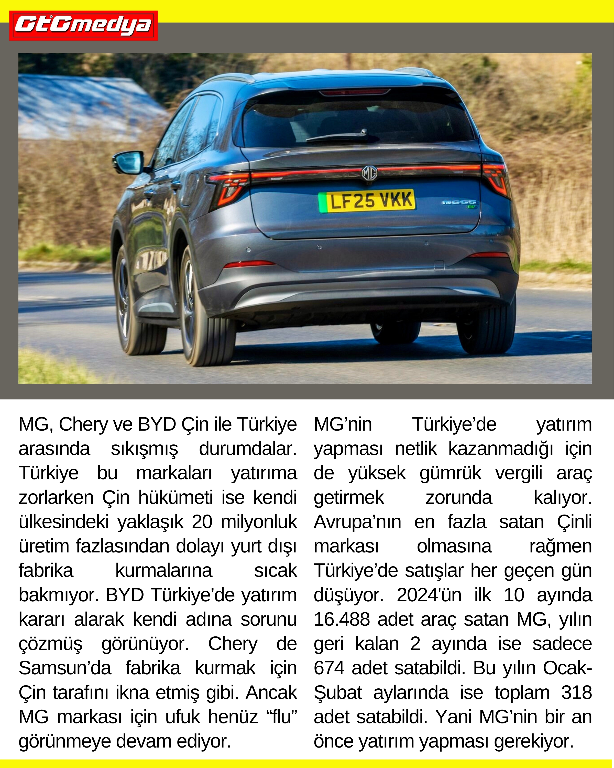 MG’nin Türkiye’de yatırım yapması netlik kazanmadığı için de yüksek gümrük vergili araç getirmek zorunda kalıyor. Avrupa’nın en fazla satan Çinli markası olmasına rağmen Türkiye’de satışlar her geçen gün düşüyor. 2024'ün ilk 10 ayında 16.488 adet araç satan MG, yılın geri kalan 2 ayında ise sadece 674 adet satabildi. Bu yılın Ocak-Şubat aylarında ise toplam 318 adet satabildi. Yani MG’nin bir an önce yatırım yapması gerekiyor.