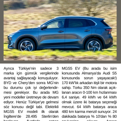 Ayrıca Türkiye’nin sadece 3 marka için gümrük vergilerinde avantaj sağlayacağı konuşuluyor. BYD ve Chery’den sonra MG’nin bu durumu çok iyi değerlendirmesi gerekiyor. Bu arada MG yeni modeller üretmeye de devam ediyor. Henüz Türkiye’ye gelmesi söz konusu değil tabi. Elektrikli MGS5 EV modeli ilk olarak İngiltere’de 28.495 Sterlin’den başlayan fiyatlarla satışa sunulacak. Daha sonra ise diğer Avrupa ülkelerinde satılacak.