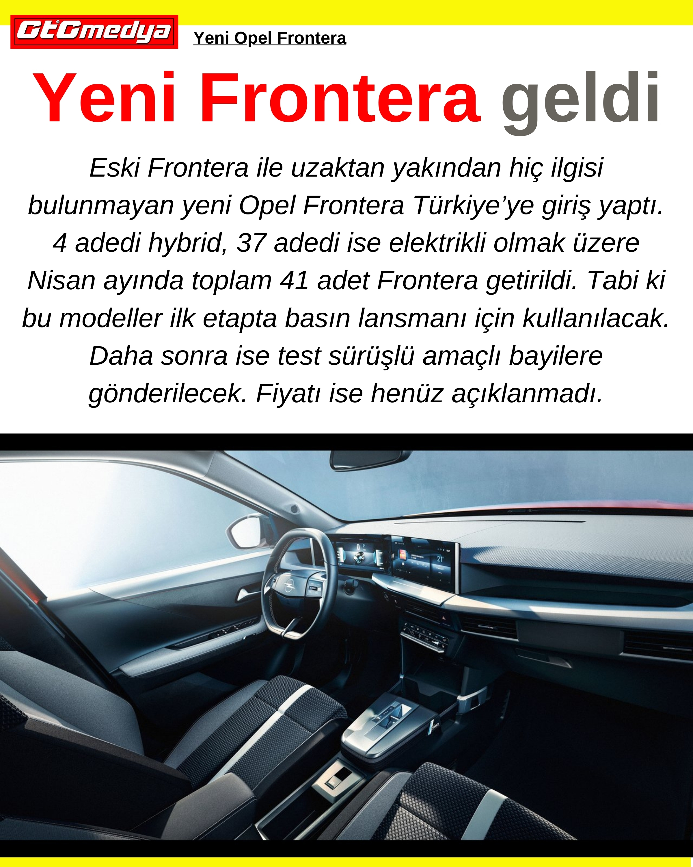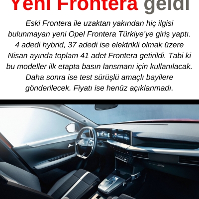 Eski Frontera ile uzaktan yakından hiç ilgisi bulunmayan yeni Opel Frontera Türkiye’ye giriş yaptı. 4 adedi hybrid, 37 adedi ise elektrikli olmak üzere Nisan ayında toplam 41 adet Frontera getirildi. Tabi ki bu modeller ilk etapta basın lansmanı için kullanılacak. Daha sonra ise test sürüşü amaçlı bayilere gönderilecek. Fiyatı ise henüz açıklanmadı.