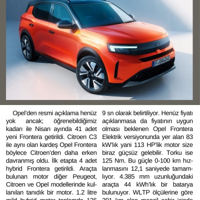 Opel’den resmi açıklama henüz yok ancak; öğrenebildiğimiz kadarı ile Nisan ayında 41 adet yeni Frontera getirildi. Citroen C3 ile aynı olan kardeş Opel Frontera böylece Citroen’den daha erken davranmış oldu. İlk etapta 4 adet hybrid Frontera getirildi. Araçta bulunan motor diğer Peugeot, Citroen ve Opel modellerinde kullanılan tanıdık bir motor. 1.2 litre mild hybrid motor toplamda 136 HP güç üretiyor ve 230 Nm torku var. Aracın 0-100 km hızlanması 9 sn olarak belirtiliyor.