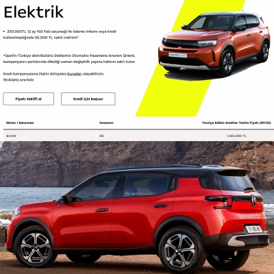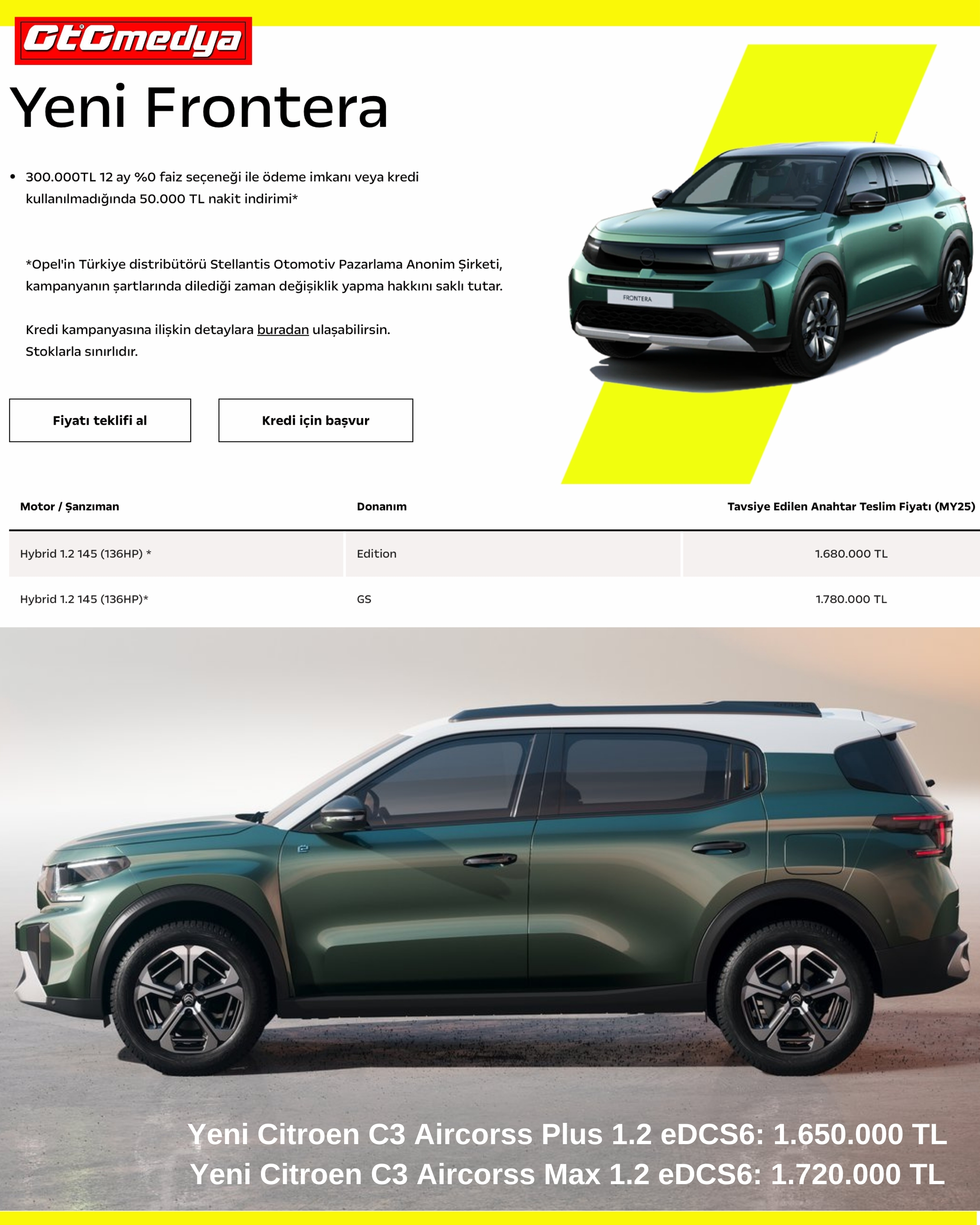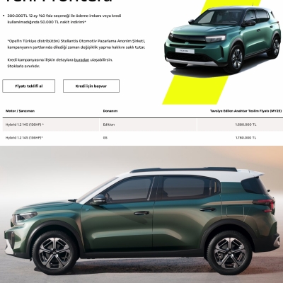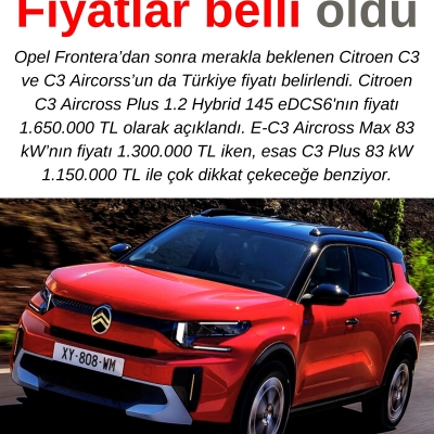 Opel Frontera’dan sonra merakla beklenen Citroen C3 ve C3 Aircorss’un da Türkiye fiyatı belirlendi. Citroen C3 Aircross Plus 1.2 Hybrid 145 eDCS6'nın fiyatı 1.650.000 TL olarak açıklandı. E-C3 Aircross Max 83 kW’nın fiyatı 1.300.000 TL iken, esas C3 Plus 83 kW 1.150.000 TL ile çok dikkat çekeceğe benziyor.