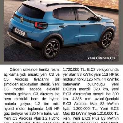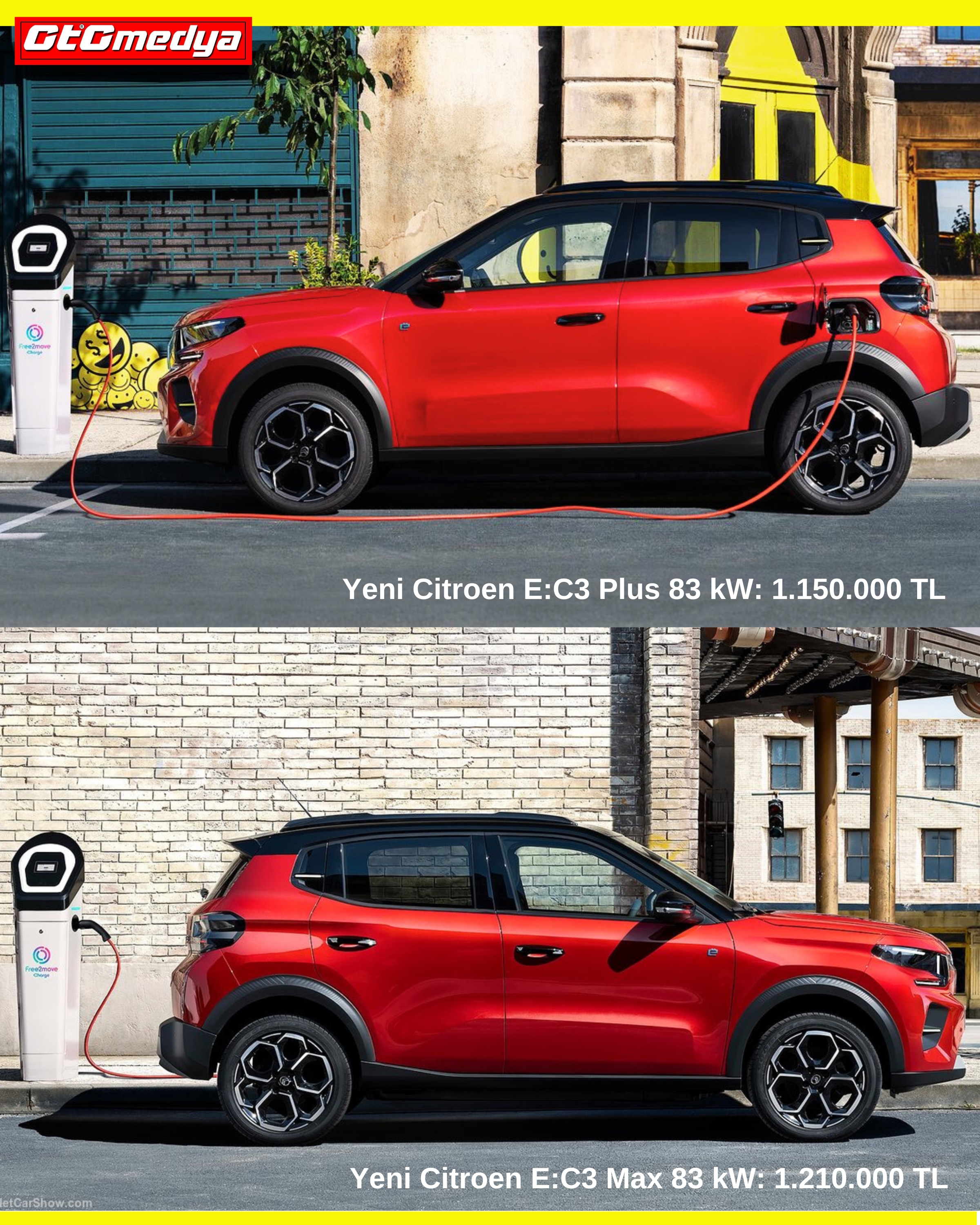 E:C3 versiyonunda yer alan 83 kW’lık yani 113 HP’lik motorun torku 125 Nm. 44 kWh’lık bataryanın bulunduğu yeni E:C3'ün menzili 320 km, yeni E:C3 Aircross’un menzili ise 300 km. 4.385 mm uzunluğundaki E:C3 Aircross Max 83 kW’nın fiyatı 1.300.000 TL. Yeni E:C3 Max 83 kW’nın fiyatı 1.210.000 TL iken, Yeni E:C3 Plus 83 kW’nın fiyatı ise 1.150.000 TL. Yani Dacia Spring’ten sonra Türkiye’deki en ucuz elektrikli otomobil. (Şimdilik)
