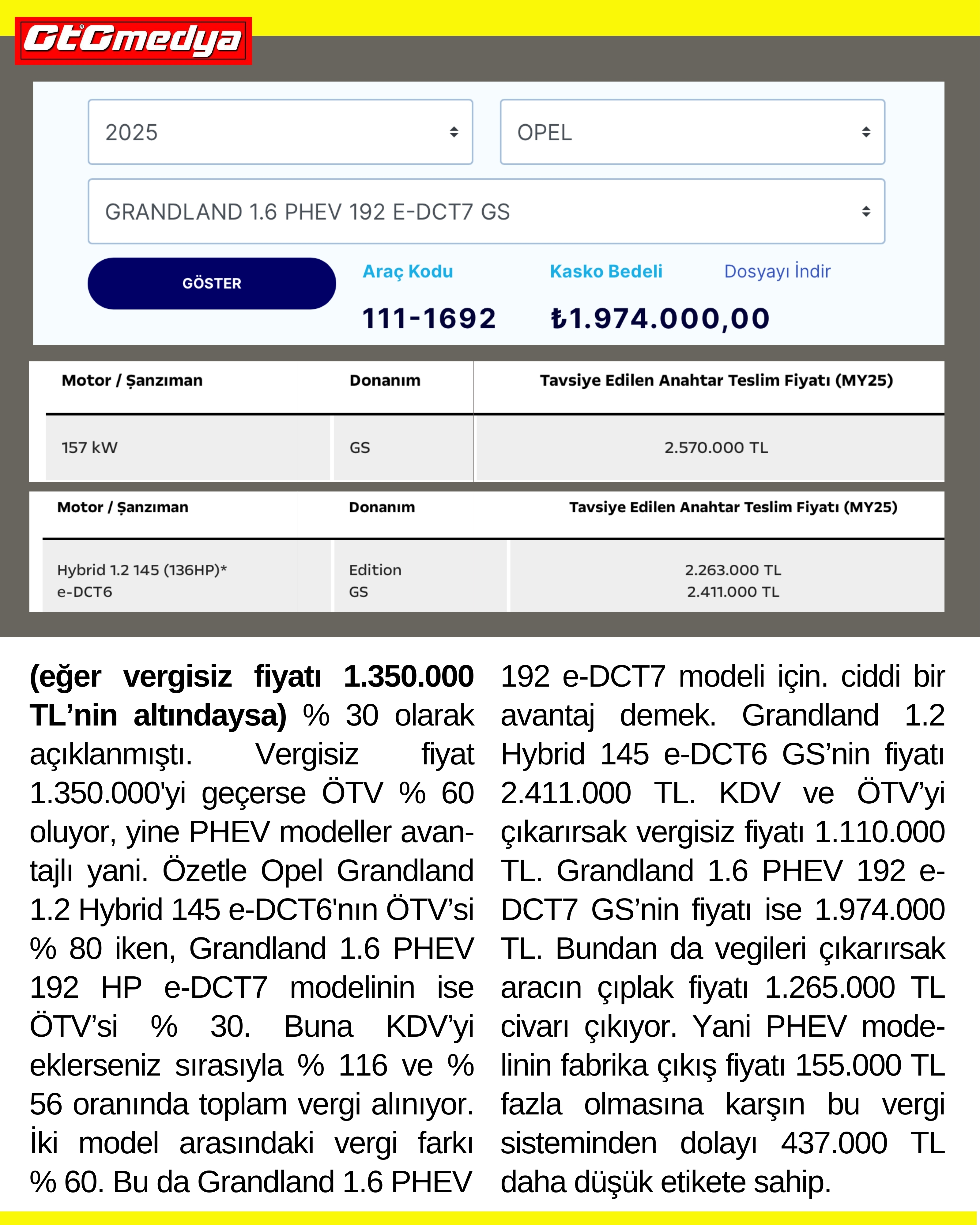 Opel Marka Direktörü Yiğit Yantaç toplantıda Grandland modeli için sonbaharda sürpriz bir yenilik daha olacağını söylemişti. Bunun PHEV modeli olacağını tahmin etmek zor değil. Ancak fiyatı ne kadar olacaktı? BYD için Türkiye’de yeni bir vergi dilimi ortaya çıkarılmıştı. İçten yanmalı 1.6 litre altı motor hacmi olan, aynı zamanda elektrik motoru bulunan ve saf elektrik menzili en az 70 km olan, CO2 emisyonu 25 g/km’nin altında kalan otomobillerin ÖTV’s(eğer vergisiz fiyatı 1.350.000 TL’nin altındaysa) % 30 olarak açıklanmıştı. Vergisiz fiyat 1.350.000'yi geçerse ÖTV % 60 oluyor, yine PHEV modeller avantajlı yani. Özetle Opel Grandland 1.2 Hybrid 145 e-DCT6'nın ÖTV’si % 80 iken, Grandland 1.6 PHEV 192 HP e-DCT7 modelinin ise ÖTV’si % 30. Buna KDV’yi eklerseniz sırasıyla % 116 ve % 56 oranında toplam vergi alınıyor. İki model arasındaki vergi farkı  % 60. Bu da Grandland 1.6 PHEV 192 e-DCT7 modeli için. ciddi bir avantaj demek. Grandland 1.2 Hybrid 145 e-DCT6 GS’nin fiyatı 2.411.000 TL. KDV ve ÖTV’yi çıkarırsak vergisiz fiyatı 1.110.000 TL. Grandland 1.6 PHEV 192 e-DCT7 GS’nin fiyatı ise 1.974.000 TL. Bundan da vegileri çıkarırsak aracın çıplak fiyatı 1.265.000 TL civarı çıkıyor. Yani PHEV modelinin fabrika çıkış fiyatı 155.000 TL fazla olmasına karşın bu vergi sisteminden dolayı 437.000 TL daha düşük etikete sahip.