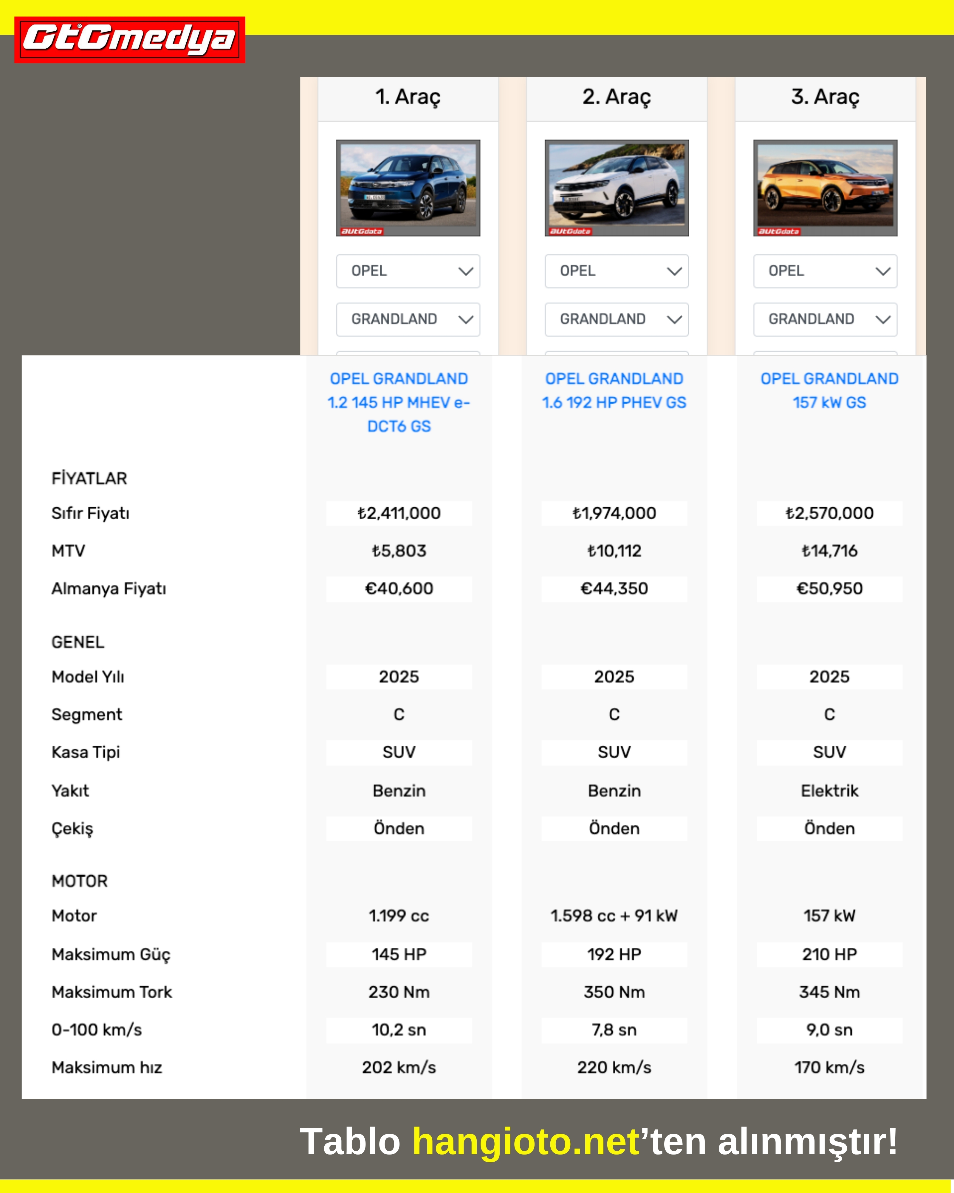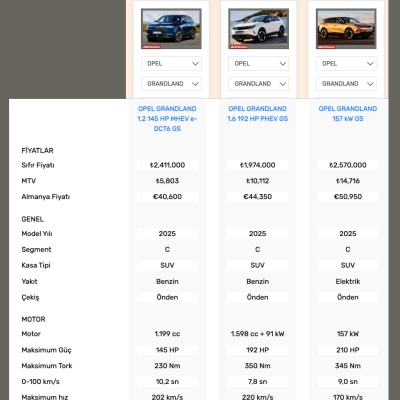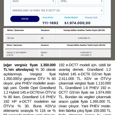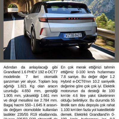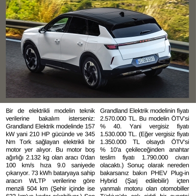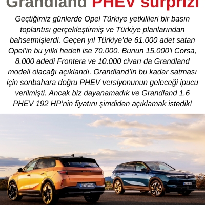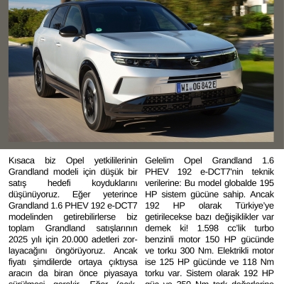 Kısaca biz Opel yetkililerinin Grandland modeli için düşük bir satış hedefi koyduklarını düşünüyoruz. Eğer yeterince Grandland 1.6 PHEV 192 e-DCT7 modelinden getirebilirlerse biz toplam Grandland satışlarının 2025 yılı için 20.000 adetleri zor-layacağını öngörüyoruz. Ancak fiyatı şimdilerde ortaya çıktıysa aracın da biran önce piyasaya sürülmesi gerekir. Eğer (açık-landığı gibi) sonbahara kalırsa satışlar daha düşük kalacaktır.